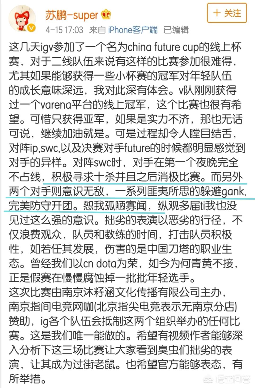 其实假赛事件在电竞圈屡见不鲜,早在几年前就有solo哥下了100美元压自己的队伍输引发的禁赛事件,那时双方队伍差距很大,solo哥所在的队伍直接开演,最终输给了弱队,他的队伍输了之后他可以赢322元,这件事就被成为322solo,成为圈内的笑柄。不过当时的大环境还是好的,并没有太多的假赛,然而随着电竞的发展,菠菜行业暗地里兴起,Dota2等游戏都受到了影响,假赛似乎成为了小比赛的代表名词,近日IG.V选手苏鹏微博爆料称自己队伍遭遇到了假赛,连裁判都给对面报点,苏鹏说IGV遇到了三个队,第一个对手是为了拿10杀,疯狂gank,拿完10杀立马嗝屁,后边两个对手意识超凡,疑似有裁判位报点。