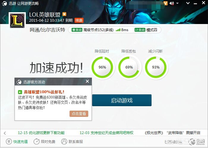 3.迅游加速器,做了10多年的老牌网游加速器。从很久以前就为玩家提供网络加速支持,安装包体积小,客服解决时间快,提供多种加速模式。在这三款中无疑是最好的一款,但就是需要交钱,如果是土豪玩家不在乎点小钱建议选择这个。安装很简单,在英雄联盟的客户端里就能找到下载,下载好还能免费试用一段时间。