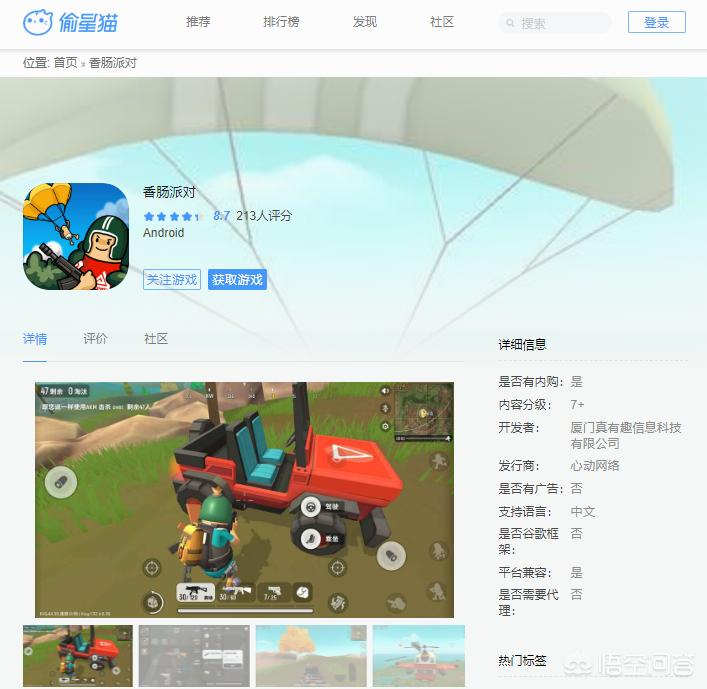 这款游戏《香肠派对》刚好昨天在偷星猫游戏社区平台首页上被推送~不小心我就看到了,楼主可以去这里下载试试~当刺激游戏火了之后,各种游戏都在想尽办法将自身与刺激结合出来诞生一种新的模式,于是乎便出现了王者荣耀突围模式,像素射击吃鸡游戏《求生之王》,无外乎就是想吸引玩家的眼球,而这款也是如此,萌萌哒的香肠人竟然也能开启越野车去享受吃鸡的乐趣,也是有点让人意想不到,不过有个脑洞,香肠没有手脚的话,会怎么样吃鸡呢~如果制作组能把这个点想破了,那绝对是破天荒的热门游戏了~