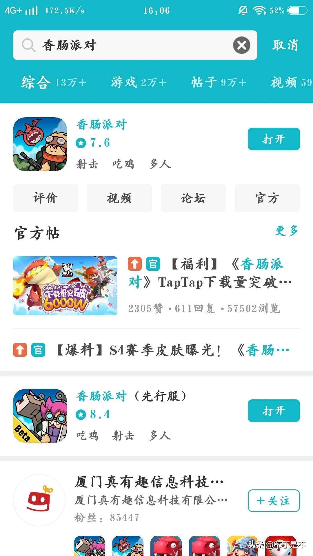 2.在百度搜索“TapTap”下载之后搜索“香肠派对”就可以下载啦!(虽然有些麻烦,但是TapTap是香肠派对官方授权的,还可以下载体验服!)
