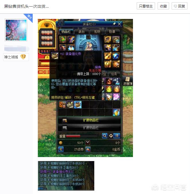 能抽到+12装备强化券的玩家实在太少了,这玩意估计比买彩票中头奖几率还要低,在国服估计都不超过1000个人,不知道大家在黑钻售货机出过最好的货是什么呢?