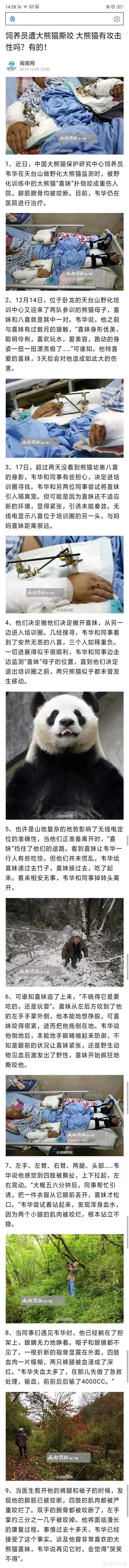 大家日常生活中能接近大熊猫的机会不多,一般都是去动物园吸猫,羡慕地看大熊猫们和它的奶爸奶妈亲昵地互动,那萌萌的样子让人动心。但是大熊猫本身还是具有一定的危险性。