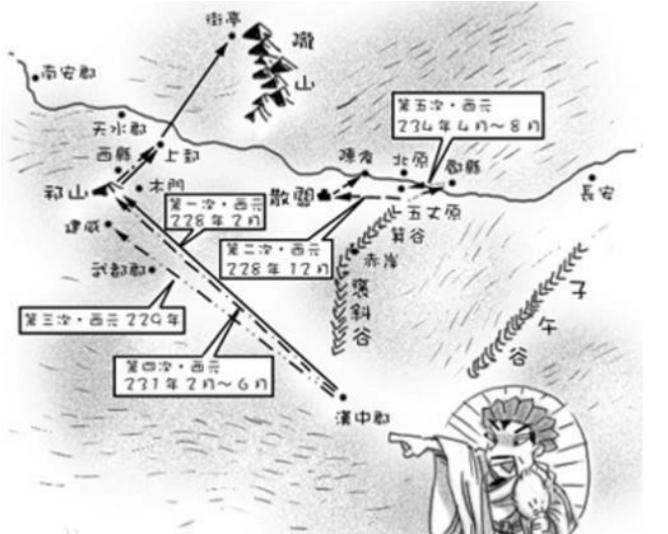 诸葛亮从祁山出兵,是贯彻落实《隆中对》策,北定中原,兴复汉室,以成霸业的重要战略方针。但是值得一说的是,诸葛亮南征后,即南中平定战后,蜀魏先后大规模作战七次。其中第四次用兵是防守,蜀魏并未交战。第五次只出偏师,诸葛亮未出汉中亲至。因此,实际上应该按照清人俞樾在《小浮梅闲话》中的说法,诸葛亮是五次北伐。