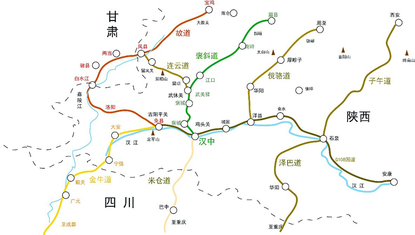 从四川进汉中到达关中,从西到东一共有五条路。分别是陈仓道、祁山道、傥骆道、褒斜道、子午道。