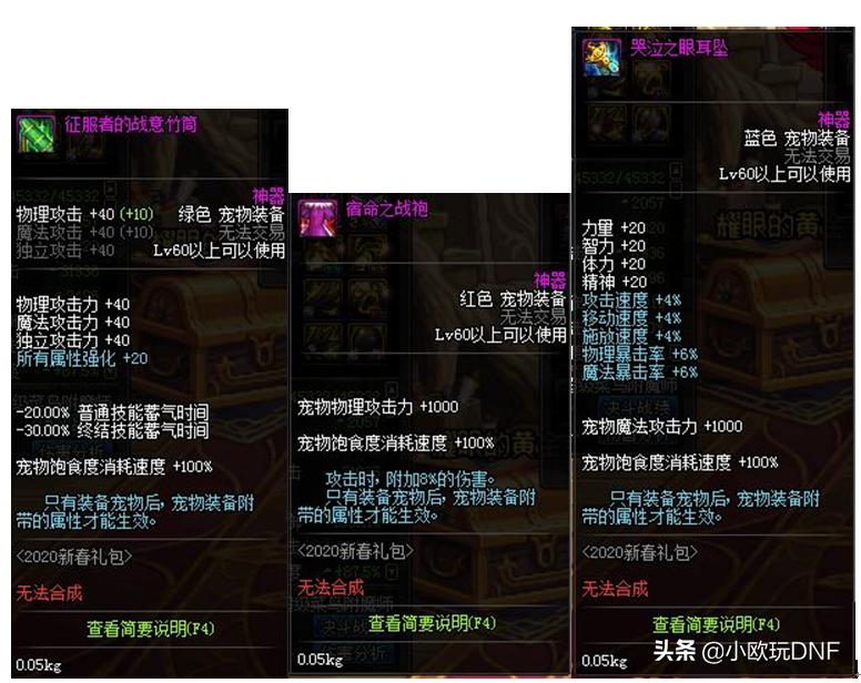 今年宠物装备每个属性相比去年都有得到改变,绿色增加10的物魔攻,蓝色增加20的四维,红色多1%的白字,三个都有提升但提升不大,推荐都有的小伙伴可以给小号使用,细节党除外。