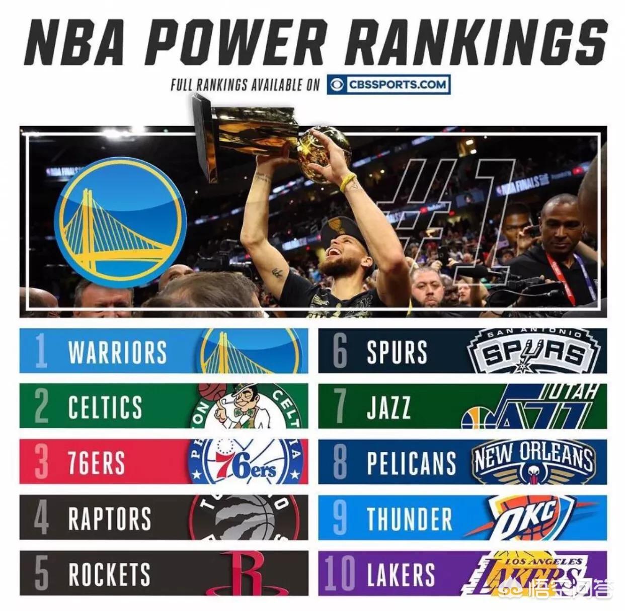 1.勇士、2.凯尔特人、3.76人、4.猛龙、5.火箭、6.马刺、7.爵士、8.鹈鹕、9.雷霆、10.湖人