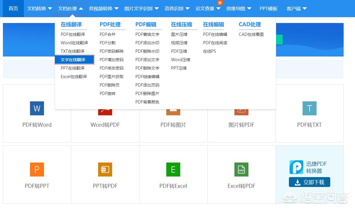 第二步、选择转换功能,从页面导航栏文档转换的下方选择文字在线翻译来进入待翻译操作页面。