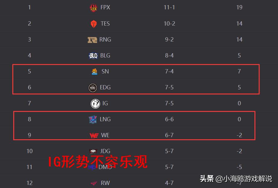 现在大家可以看一下lpl各自站对他们的一个综合排名,在ig输给了we和blg的之后可以说他们的形式真的是不容乐观,有可能连季后赛都进不去。