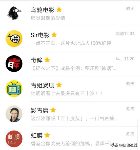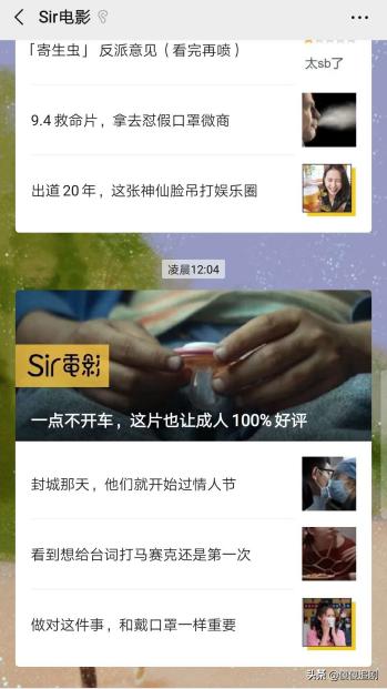 2.Sir电影是我看得最多的公众号了,是广州的一家公司(毒舌影视),现在已经不止做公众号,还有APP,内容电商等,是影视行业排名第一的垂直媒体。每天推荐的内容不仅电影也有电视剧,也会有一些影视行业相关的信息,比如金像奖、奥斯卡等等。推荐的电影电视剧一般都是在热播的,有时候也会转载其他平台的一些文章,但基本每天会有一篇Sir原创,Sir的文风很鲜明,剧情介绍比较少,偶尔也有少量剧透,但更多的是评论类,慢慢我就看习惯了。