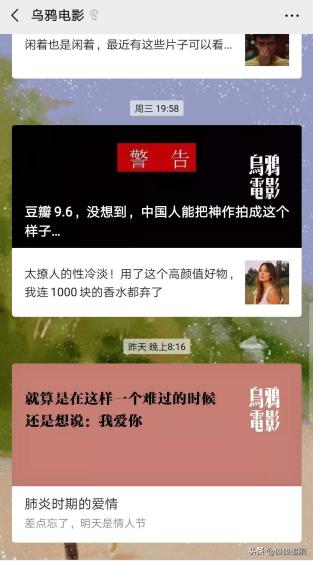 1. 乌鸦电影是全国第二大电影公众号,每天都会至少推荐一部高质量电影,推荐的电影可能是近期比较热门的,或者是根据不同时节推出相对应的电影,有很多小众电影和冷门领域的,文章基本都是团队原创,文章内容会有少量剧透,有故事情节的介绍。