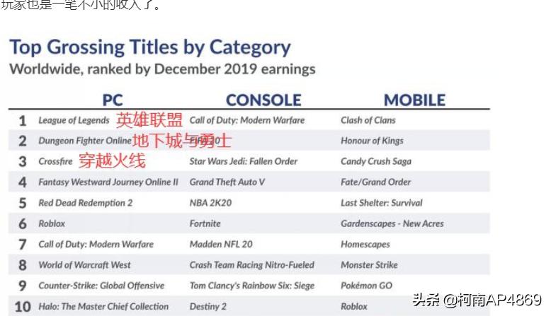 首先我们从截图中可以看到2019年全球网游收入排行榜,其中第一名是LOL、第二名是DNF、第三名是穿越火线。说实话,LOL能够排名第一,真的是实至名归,虽然英雄联盟已经进入了S10赛季,但是召唤师们对于这款游戏的热情始终是有增无减的,全球的玩家群体依然很多。而穿越火线的氪金程度究竟有多高,想必大家都是有目共睹的,这款游戏排名第三也没有什么好奇怪的。