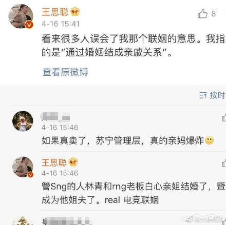 不过随后,王思聪开始解释,说联姻只是RNG老板的亲姐和SNG的员工结婚,达成联姻!