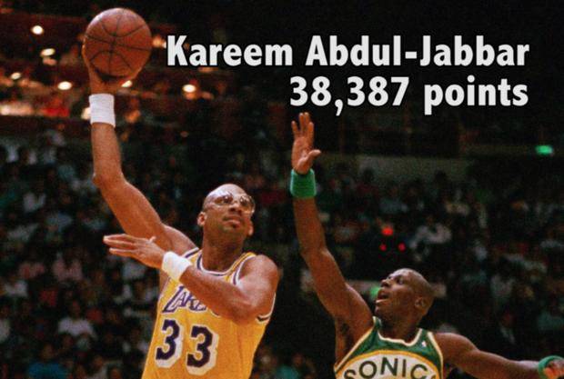 “天勾”贾巴尔,37岁前合计出场15个赛季,拿到31527分。接下来他又打了五个赛季,输出6860分,定格在38387分。