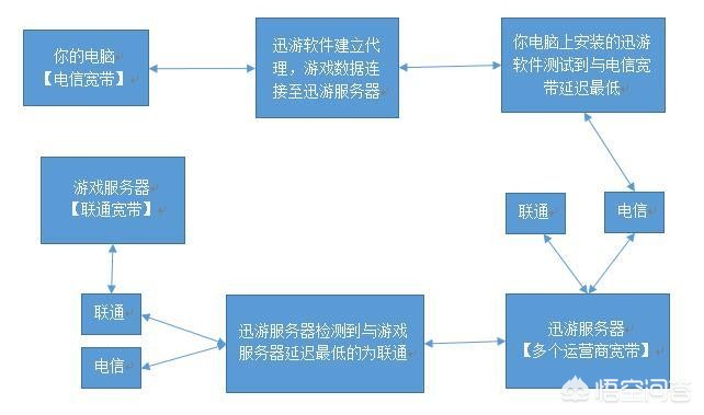 迅游在你的电脑上通过隧道代理或者VPN的形式连接到与你所在网络延迟最低(质量最好)的迅游服务器,该服务器一般都是GBP多线接入的或类似技术/形式,然后通过巡游的服务器连接到游戏所在的服务器,使得你不需要收到跨运营商网络带来的巨大延迟。