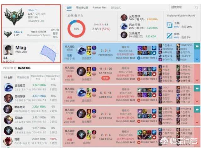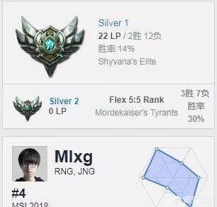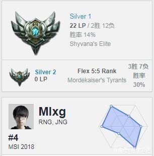 其实这张图是好久之前的了,S8世界赛开始之前,有网友在韩服发现了一个只有白银1段位的账号居然是RNG打野Mlxg的账号,胜率只有14%。不过仔细查看这个账号近期的战绩会发现,这并不是一个活跃的账号,而且玩的也不是打野英雄。