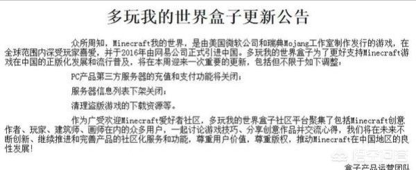迷你世界是由深圳迷你玩科技有限公司在2015年12月发布的一款游戏。当时赶在网易代理Minecraft在国内的版权之前先行发布了迷你世界。玩家体验之后纷纷说其盗版Minecraft。但深圳迷你玩科技有限公司不为所动,先后进行更新。直到网易进行维权以后,依然坚持开发迷你游戏的后续工作。并声称不会下架迷你世界相关产品。之后网易将其高上法庭,前前后后三年起诉,但败诉了。最后以网易撤诉为结果此事告一段落。迷你世界依然在运行中。