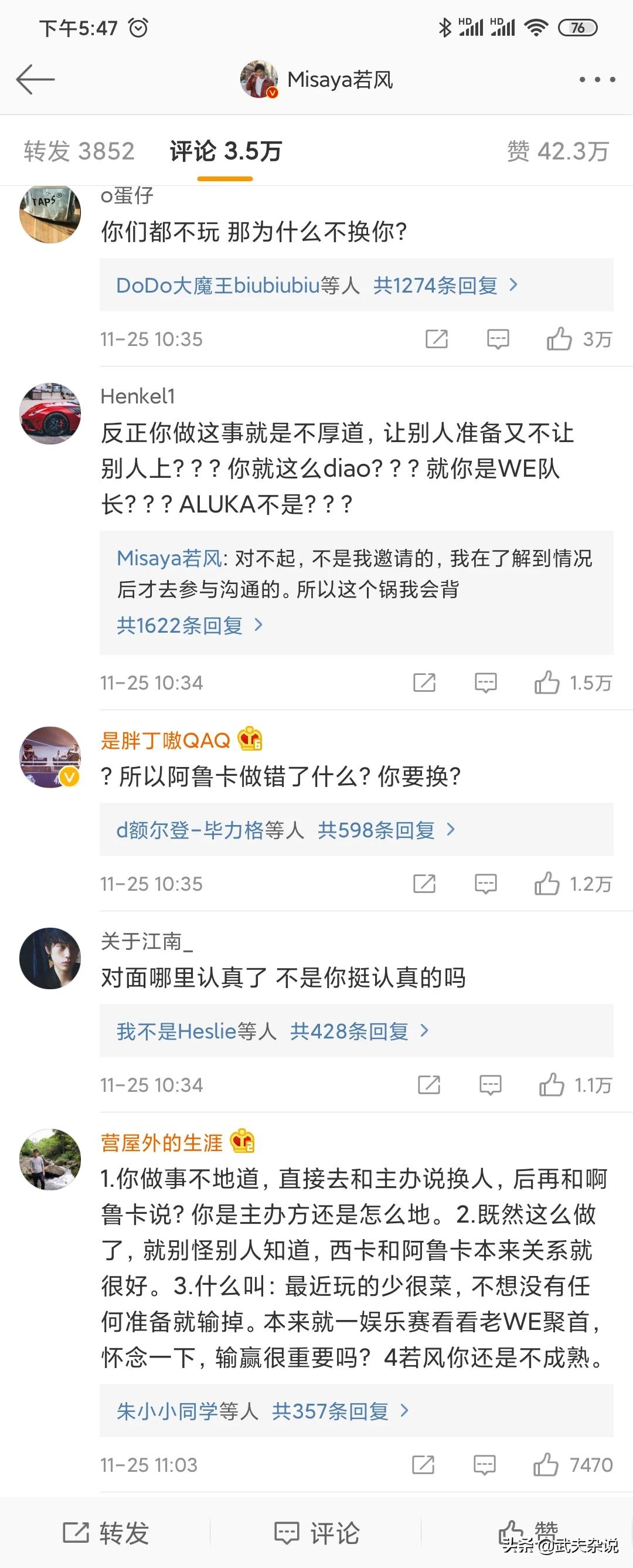 此次事件我认为若风娱乐赛认真换下Aluka有所不妥,西卡带节奏讨论其妻子也不占理,最冤枉的还是阿鲁卡本人,希望此次事件能圆满解决,让我在看一次阿鲁卡!