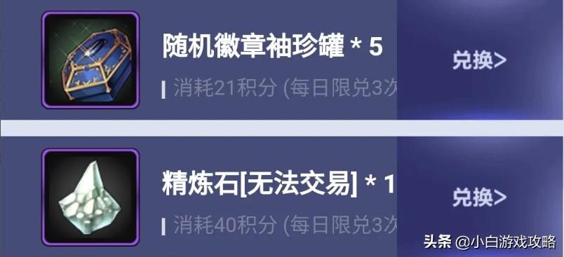 总结一下如果你这积分足够多的话,那肯定是两个都兑换的,那如果你不够多的话。我个人是建议拿徽章,第一徽章是需要金币购买的,拿我是不是就可以节省很多金币下来了,且兑换的数量5个而且积分才21,我个人觉得比精炼石要划算一点,当然也不是说精炼石就不划算,因为前期的低级武器你会拿去强化吗?所以你拿了放着也没有用,拿我还不如换徽章。当然这只是个人建议,具体怎么来还得看你自己。