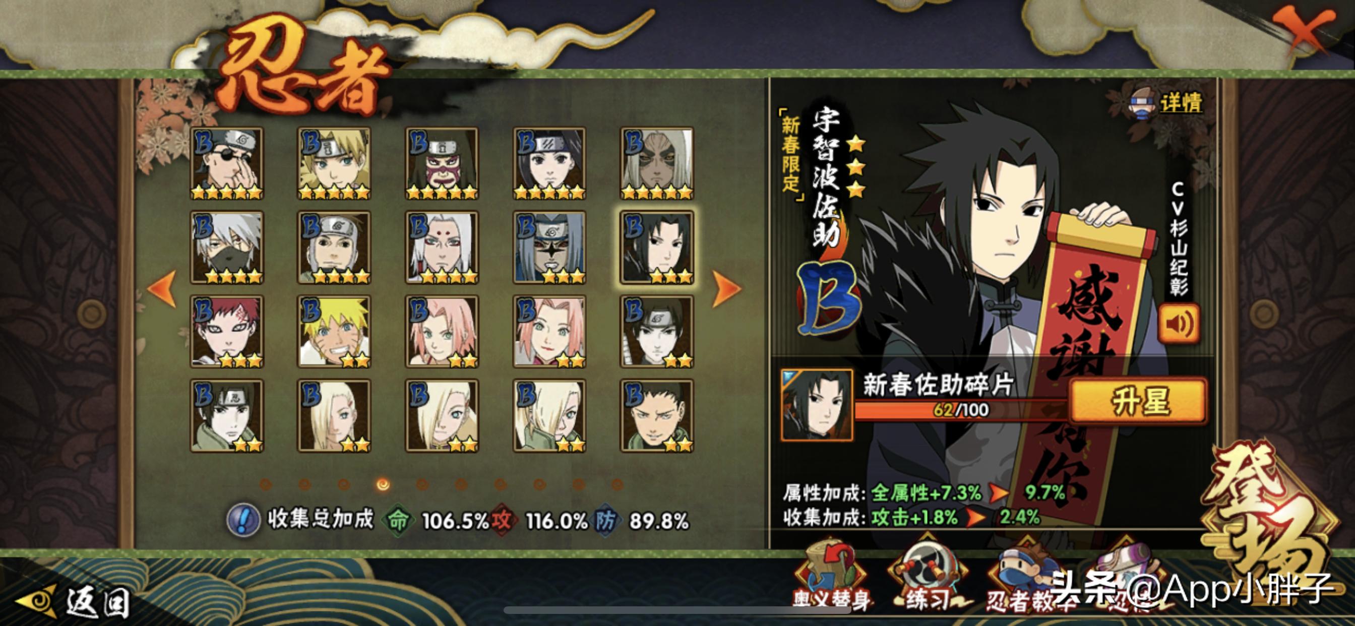 其实新春牙强度也不低,但上手难度比较高,我一直玩不来犬冢牙系列,如果你比较擅长这个类型的忍者可以尝试选择,反正看别人用这个忍者打我的时候也挺好玩的,至于新春佐助,强度方面一般,无差别里还算不错,但他有个优势,那就是他的收集加成是攻击属性,我之前都把他给升星了。