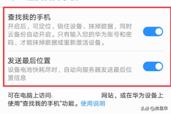 5、第五步云服务数据保护类型的还有一个查找我的手机功能,开启之后,可以定位,锁住设备,清除手机数据,发送最后位置帮助找到我们的手机,如下图所示:
