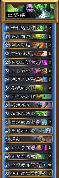 现在天梯奇迹贼和任务术看起来热度是最高的,所以我抄了一套新版本的亡语瞎,带厕所和小塞布,加上滑铲,可以有效压制奇迹贼和任务术,熟练度提升后,胜率不俗。