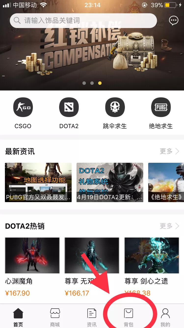 我看大家都是网页版,我就分享一下手机版如何将购买的饰品跟枪械皮肤等东西如何取到游戏中。- 第一步,打开G5gameAPP后在最低端找到背包然后点进去。