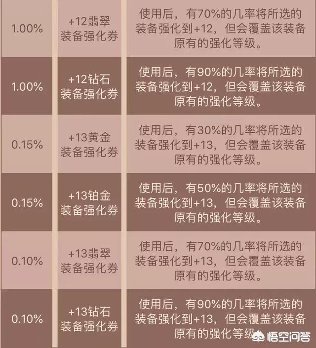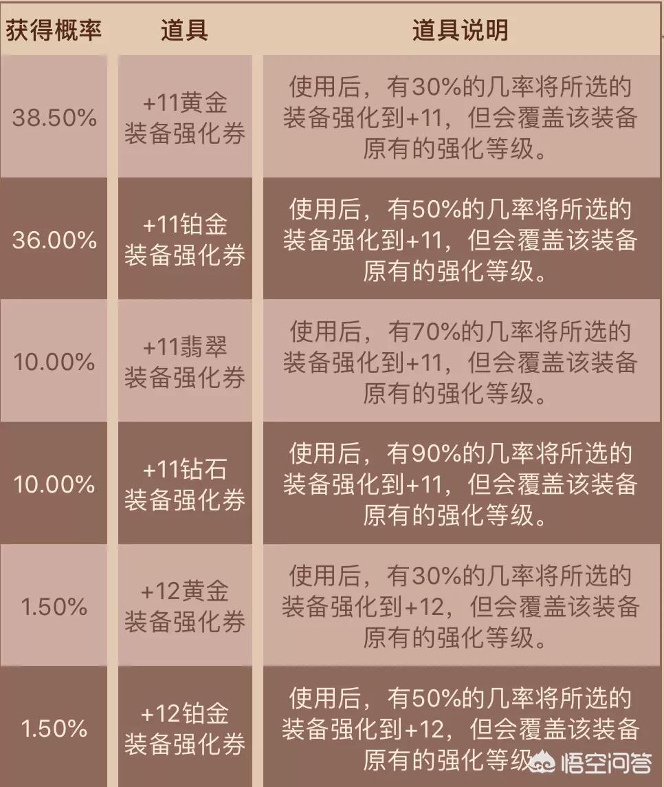 5%几率的青铜装备强化券,可以用随机变更券调整至50%几率的+11铂金强化券。这个券强化成功的概率比较低,但是他的强化用的,那么他价值就随之而提升,成功率虽然低,但是一旦成功了,回报也非常高的,这得看个人的运气。