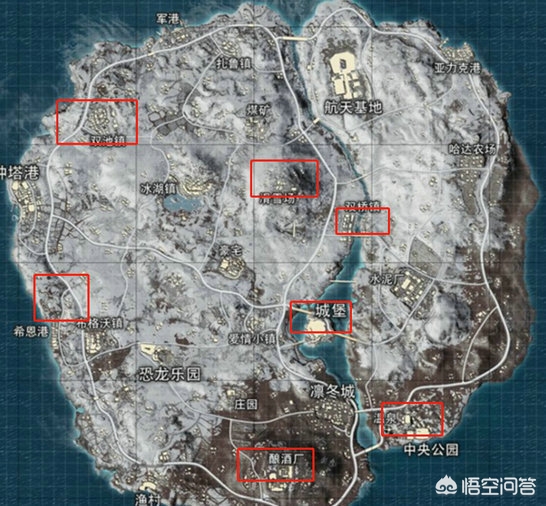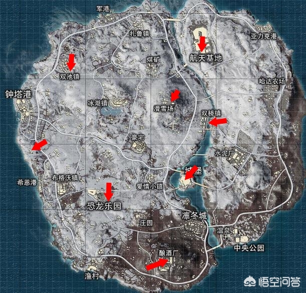 城堡(中间)、滑雪场(场字上方)、双桥镇(镇中心,结冰湖面上)、双池镇(池字上方)、航天基地(天字上面)、酿酒厂(酒字下方)、恐龙乐园(乐字上面)、希恩港(港字上方,靠近海边)。
