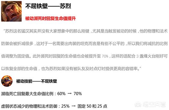 天美为了给卖皮肤做铺垫,在今天得正式服更新中加强了苏烈,具体改动就是现在的被动触发时回复70%最大生命值,比原来提高了10%。触发被动之后减少的物防和法防从百分比改成了固定的数值,加强了!苏烈作为一个冷门英雄,除了在职业赛场上比较热门以外,在路人局中非常的冷门,高端局也没有多少玩的,低端局的作用就更小了。最早的苏烈非常的变态,后来几经削弱以后就慢慢退出上单霸主舞台了,这次加强配合新皮肤上架,想必苏烈会在王者峡谷迎来一波春天。这也是天美一贯的作风了,热门或者冷门英雄突然加强必有新皮肤要出了。