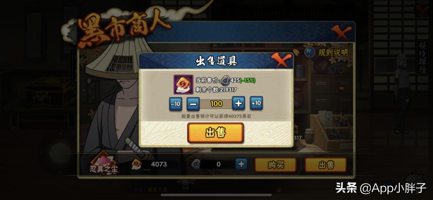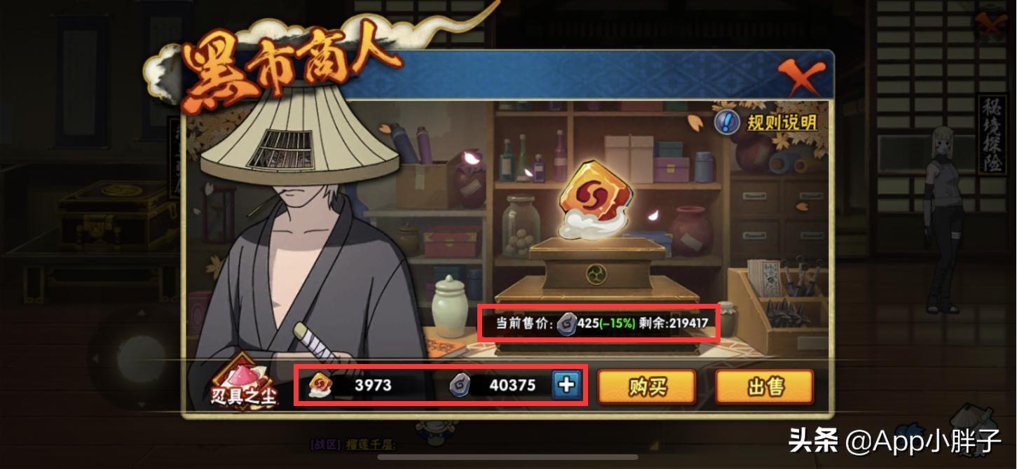 火影忍者手游里的黑市商人是一个被很多玩家忽略的地方,这个玩法在最早上架的时候有很多人去参与,因为当初是可以通过买卖符石来赚取中间的差价,然后通过符石来生符石,有些玩家当初通过这个玩法存了很多材料,但魔方似乎不打算让玩家进行如此大规模的交易,所以就直接修改了规则,现在每个服务器的黑市商人应该都是下面这个情况,每个符石的价格是425黑石。
