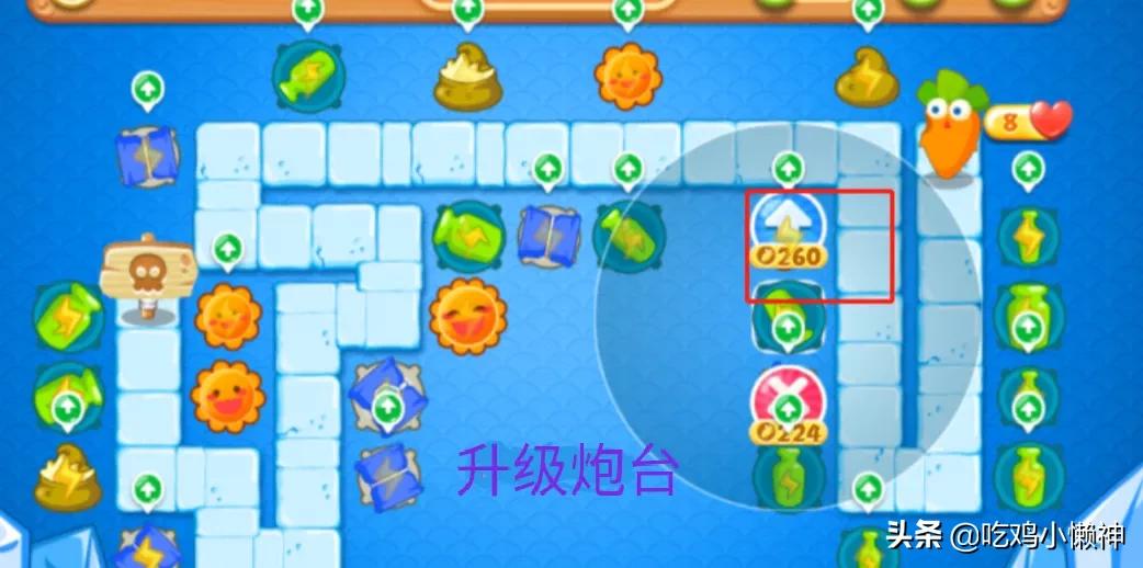 在萝卜的家附近放置一个瓶子炮塔并对瓶子炮塔进行升级,可以对萝卜进行最后的保护。