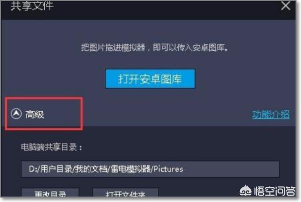 5,如需要传送其他文件;可以展开“高级”;进行路径设置,即可完成模拟器与电脑的连接,将文件拷贝到设置的路径即可。