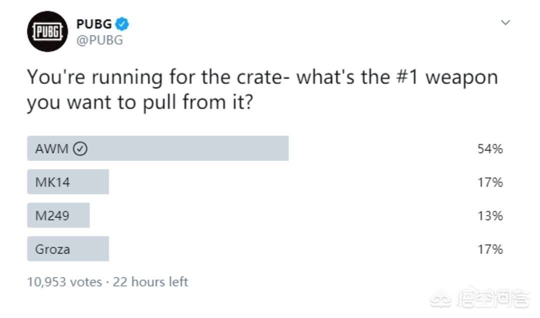 绝地求生官方在推特中发起了一项投票,选出玩家们最希望出现在空投箱中的武器。根据数据统计,结果表明54%的玩家选择AWM,13%的玩家选择M249,MK14和Groza分别排名第二三位,M249成功垫底。从这个简单的数据可以看出,玩家们最热爱的武器还是单发狙。