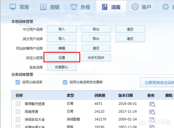 三、在词库界面点击“自定义短语”右边的“设置”。