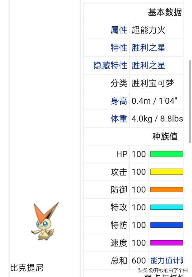 比克提尼是是超能力属性和火属性的幻之宝可梦于第五世代(黑白)登场的。它的特性是胜利之心。