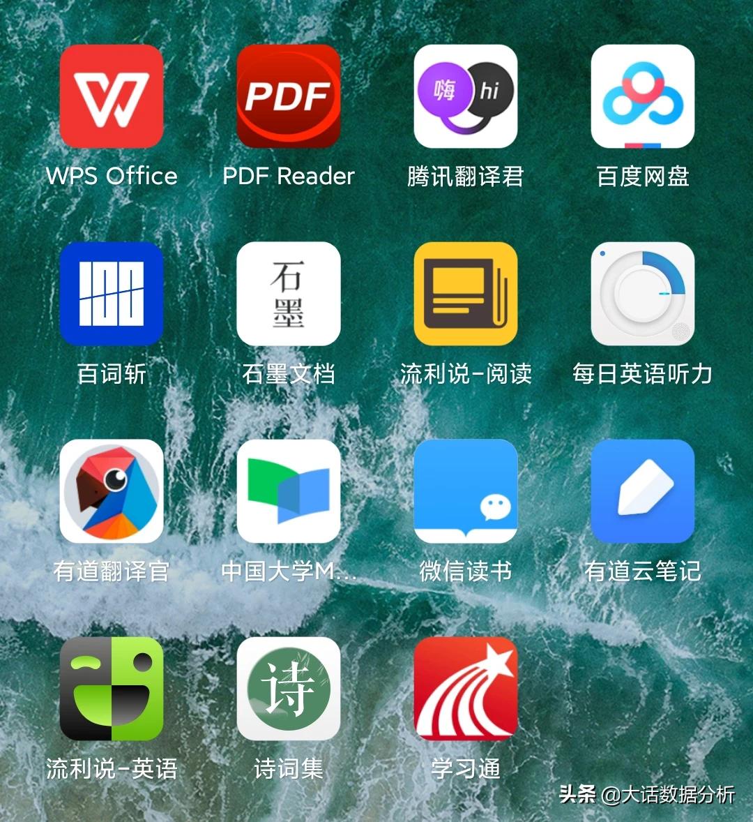 在学习中,我推荐一些手机软件,比如,WPS,PDF阅读器,腾讯翻译君,百度网盘,百词斩,石墨文档,流利说-阅读,每日英语听力,有道翻译官,中国大学慕课,微信读书,有道云笔记,英语流利说,诗词集,学习通。