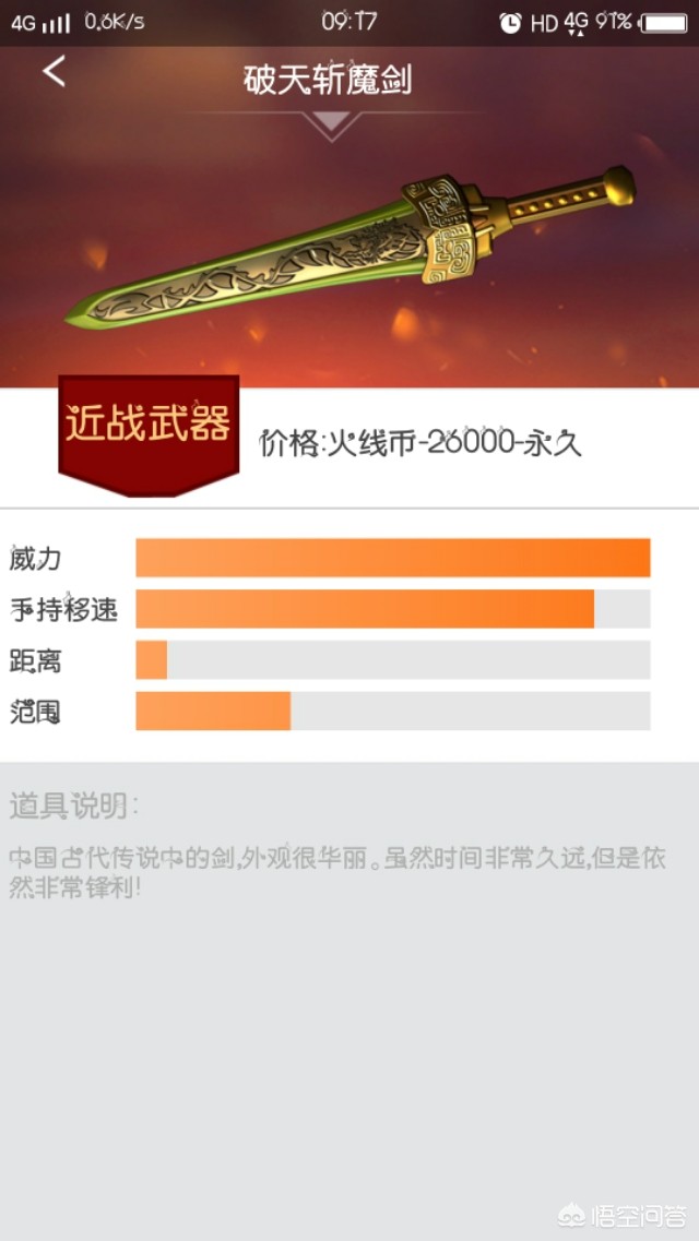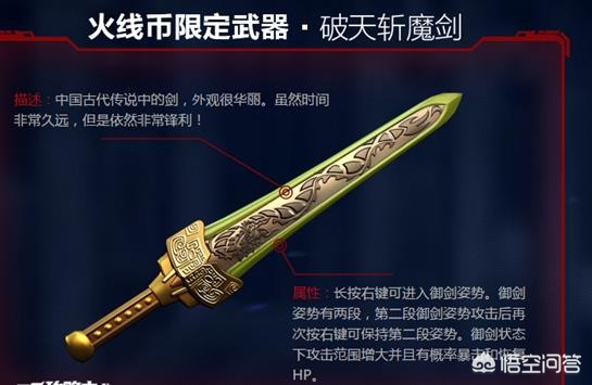 CF破天斩魔剑,是CF火线币限定武器,由于其售价高达26000火线币,所以很少有玩家可以享用这把神器,那么破天斩魔剑的属性如何呢?