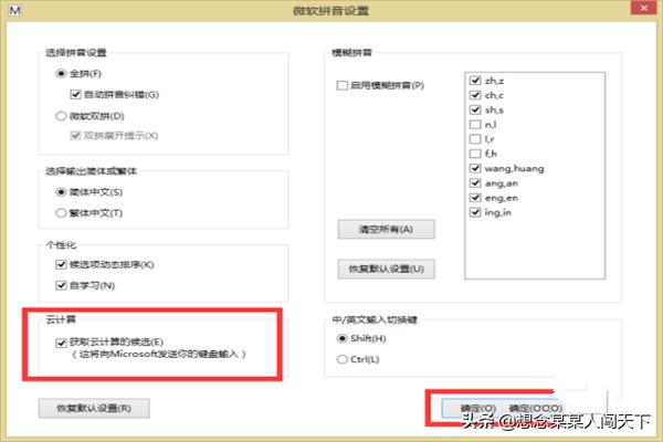 5.第五步:在弹出的“微软拼音设置”中勾选下方的云计算——获取云计算的候选复选框,点击确定。