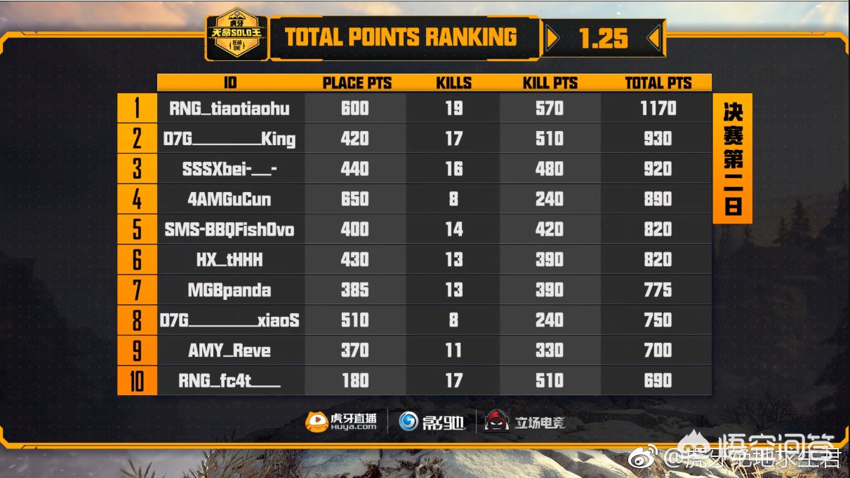 截止到目前,孤存以890分的积分暂列第四,跟第二第三的差距都不是很大,跟第一名也是,目前第一的是RNG的跳跳虎,1170分。明天还有比赛,到底谁能夺得第一名呢?让我们拭目以待吧!