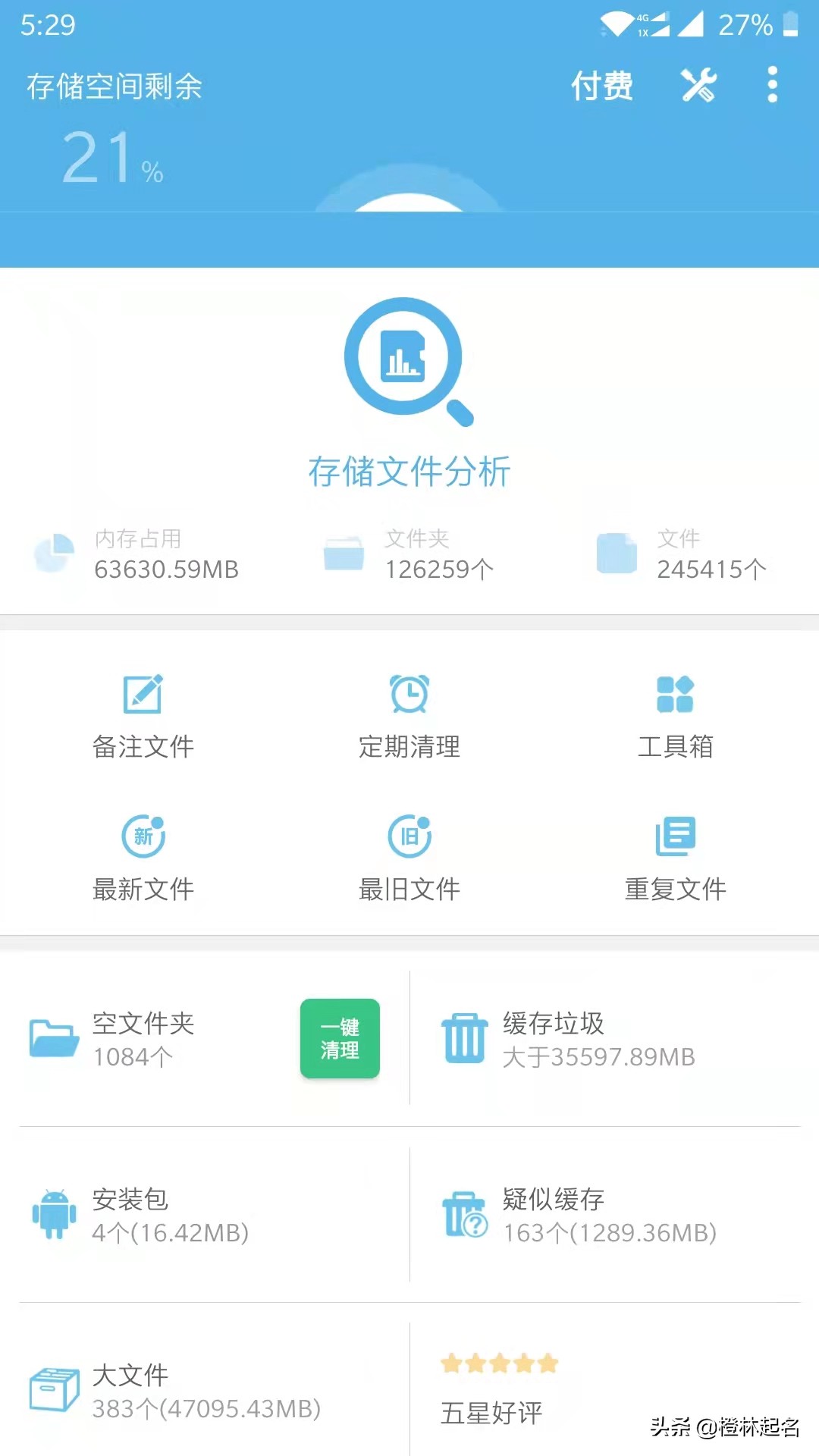 一加五搭载骁龙835,运存8G 内存128G,现在骁龙最强的处理器是骁龙888相比835差了五六代呢,但满足日常使用需求是足够用的,这得益于我使用的一款安卓手机清理软件,名字叫:储存空间清理。这是一块收费软件,但三块五毛钱能使用一生。