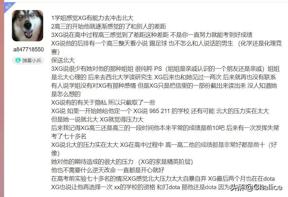 补一下全程: xg高二认识的一个大一届后来上北大的姐姐,在高三那段日子里每天给予关心和打气,一起上北大的期望最终转变为压力,在高三学习滑坡后,xg心态崩盘逃避高考直接出国。在得知出国消息后姐姐发了一封责备为主亦隐含期待的邮件,xg感受到姐姐对自己选择的失望,认为自己是懦夫。