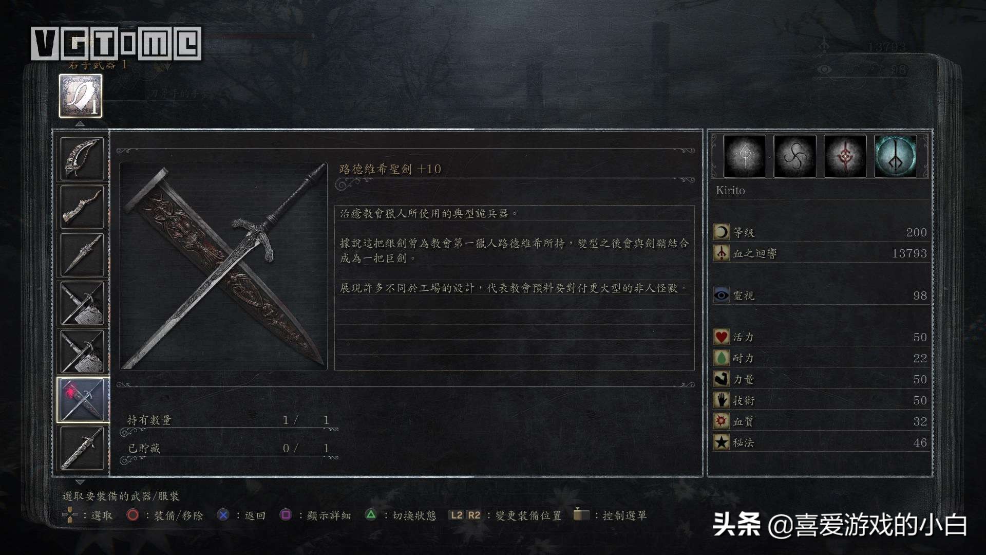 然后这个BOSS感觉彻底变了个人,从原来疯狂的野兽变成了身经百战的战士,剑招又快又狠,各种招数变化令人措不及防,真的是挨上就死碰上就亡,二阶段气势磅礴的敌人,配合上令人振奋的BGM,哪怕是敌人也会让玩家热血沸腾,想要和其进行荣誉的对决。当然,这场战斗并不公平,毕竟玩家是可以复活的,在经过无数次反复骚扰之后,最终他还是倒在了小白的剑下,这时候换上猎人服装和仅剩一个头的他说话,如果选择继承了他的荣光,还会得到他的月光大剑。