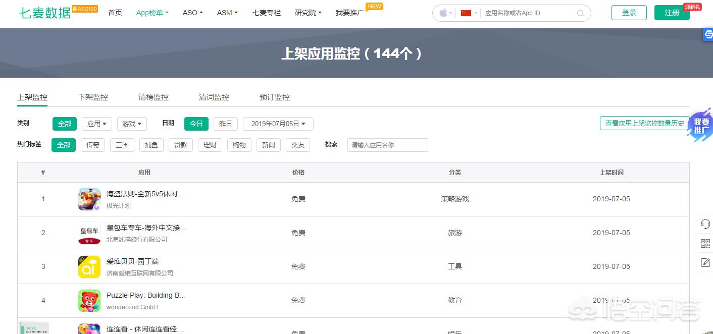 七麦数据在顶部导航的APP榜单一项当中,有一个【上架/下架监控】,这个可以观察当天APP的上架下架情况,应该可以查看每天新上架的APP。