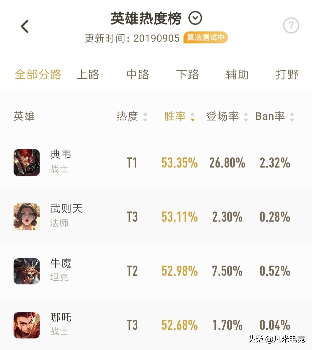 典韦确实在本赛季,静悄悄的崛起了,现在胜率居然已经登顶,超过一众有身材有样貌的刺客战士,连常年坐在第一宝座的牛魔王也被挤下来了。要知道撼动牛魔王的英雄得有厉害啊!