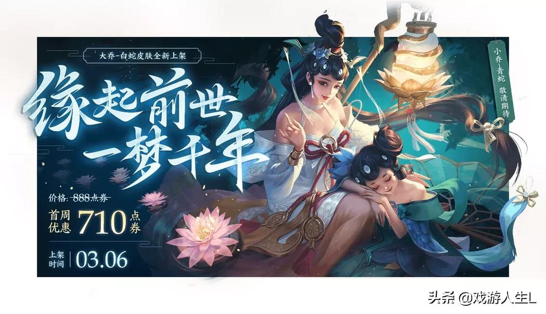 3.大乔白蛇史诗皮肤上架,充值活动开启:出乎意料的是,“青白蛇”海报分明曝光的是两款皮肤,但是目前只有大乔一白蛇先行上线,同样被设定为史诗皮肤,首周折扣价格是710点券,购买后必得“灯于身游”的局内动作特效。另外官方大大同时上线了充值优惠活动,在活动三天内充值满988点券即可额外赠送大量皮肤碎片、荣耀积分优惠,相当于也是为了提升白蛇皮肤销量设置的充值福利。