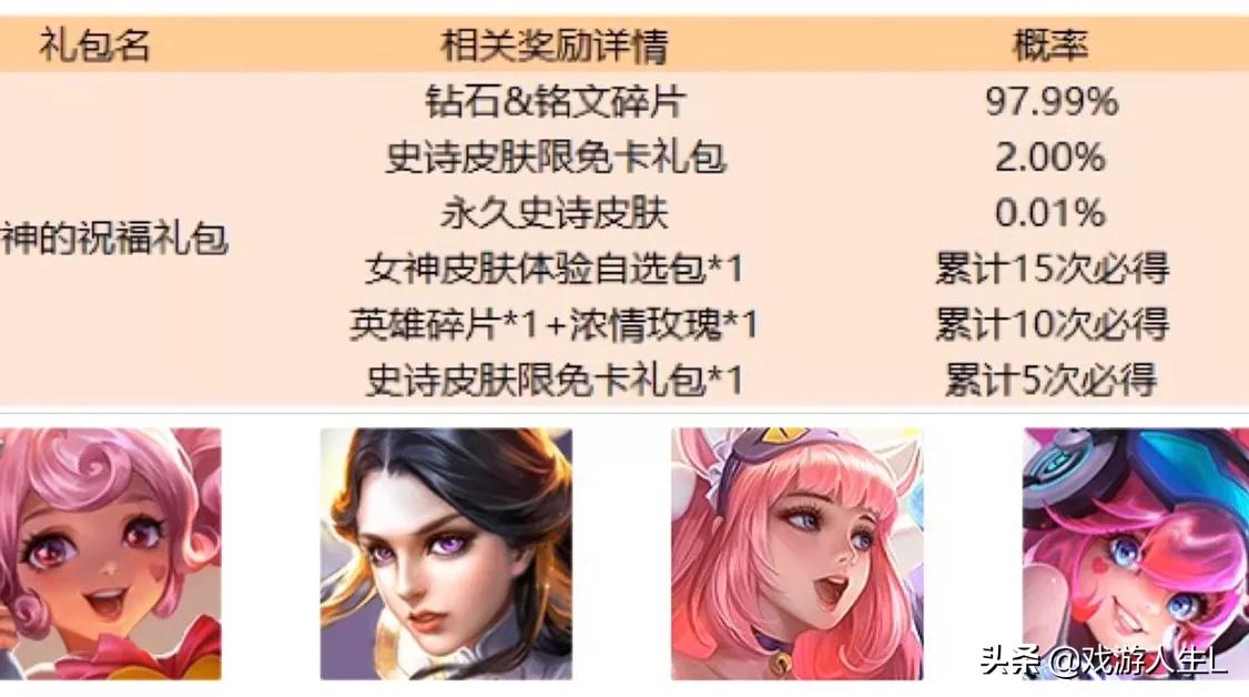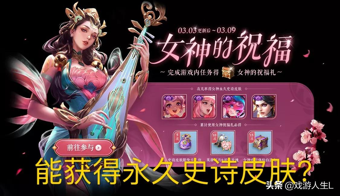 1.女神祝福礼包开启:在今日活动更新后,玩家通过日常签到和完成指定对局,都有机会获得女神祝福礼包,奖励包括:史诗皮肤体验周卡、永久史诗皮肤(包括紫霞仙子、大乔猫狗日记、缤纷独角兽)、英雄碎片和铭文钻石等道路,但是最受青睐的永久史诗皮肤概率只有0.01%;玩家在签到获得的史诗皮肤限免自选包奖励是必得史诗皮肤的体验周卡的。
