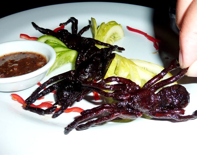 油炸蜘蛛采用的是柬埔寨生长的一种黑色长毛毒蜘蛛,入油锅炸至通透,再撒一些调味品,香脆可口。想象一下,这种八条腿的生物在活着的时候张牙舞爪的样子,你敢吃吗?不过在当地人的眼里,却是一道“无上的美味”。