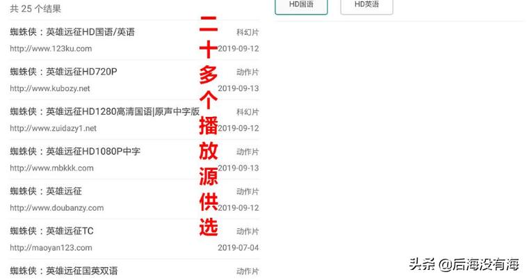 资源猫汇集了26个网站的资源,其中20个聚合影视网站和6个高清视频源的网站,所以大家在搜每个电影的时候,软件会提供给大家20多个播放源,大家可以根据清晰度和缓冲速度等自己选择片源,非常的给力。