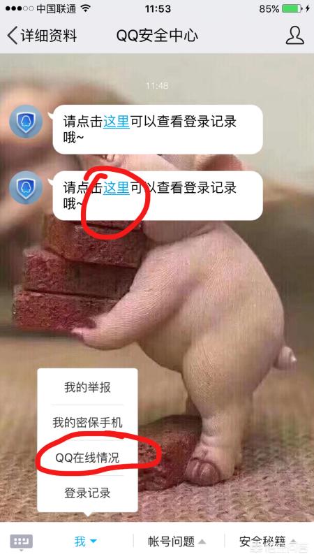 4、进入后,点击左下角的“我”,然后选择第二个“QQ在线情况”,再点击弹出来的“这里”即可。