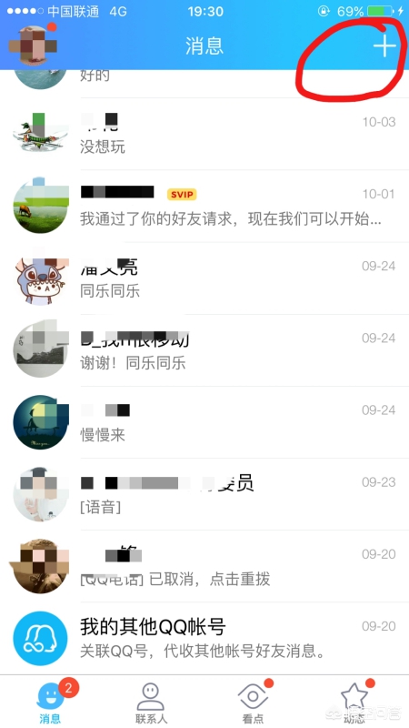 1、首先,打开自己手机上QQ,在QQ的右上角,有一个“+”号,选择这个“+”号。